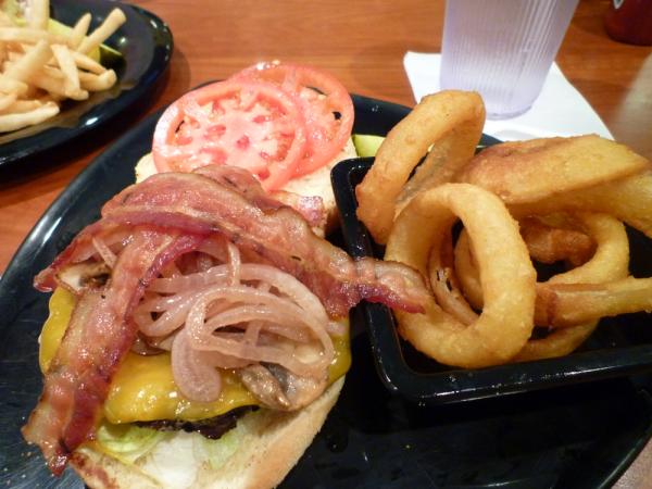 BLT チーズバーガー with オニオンリング (左) と